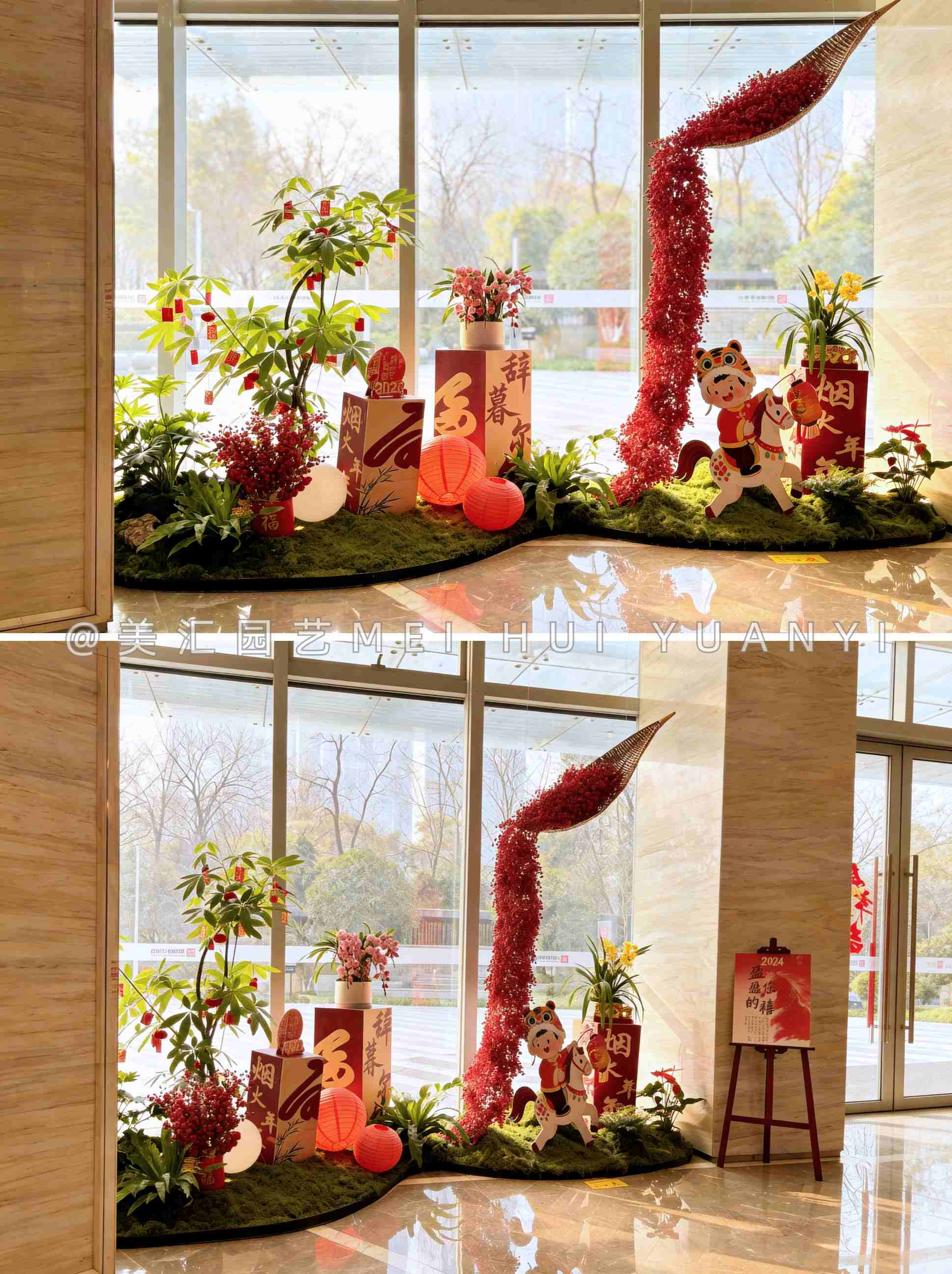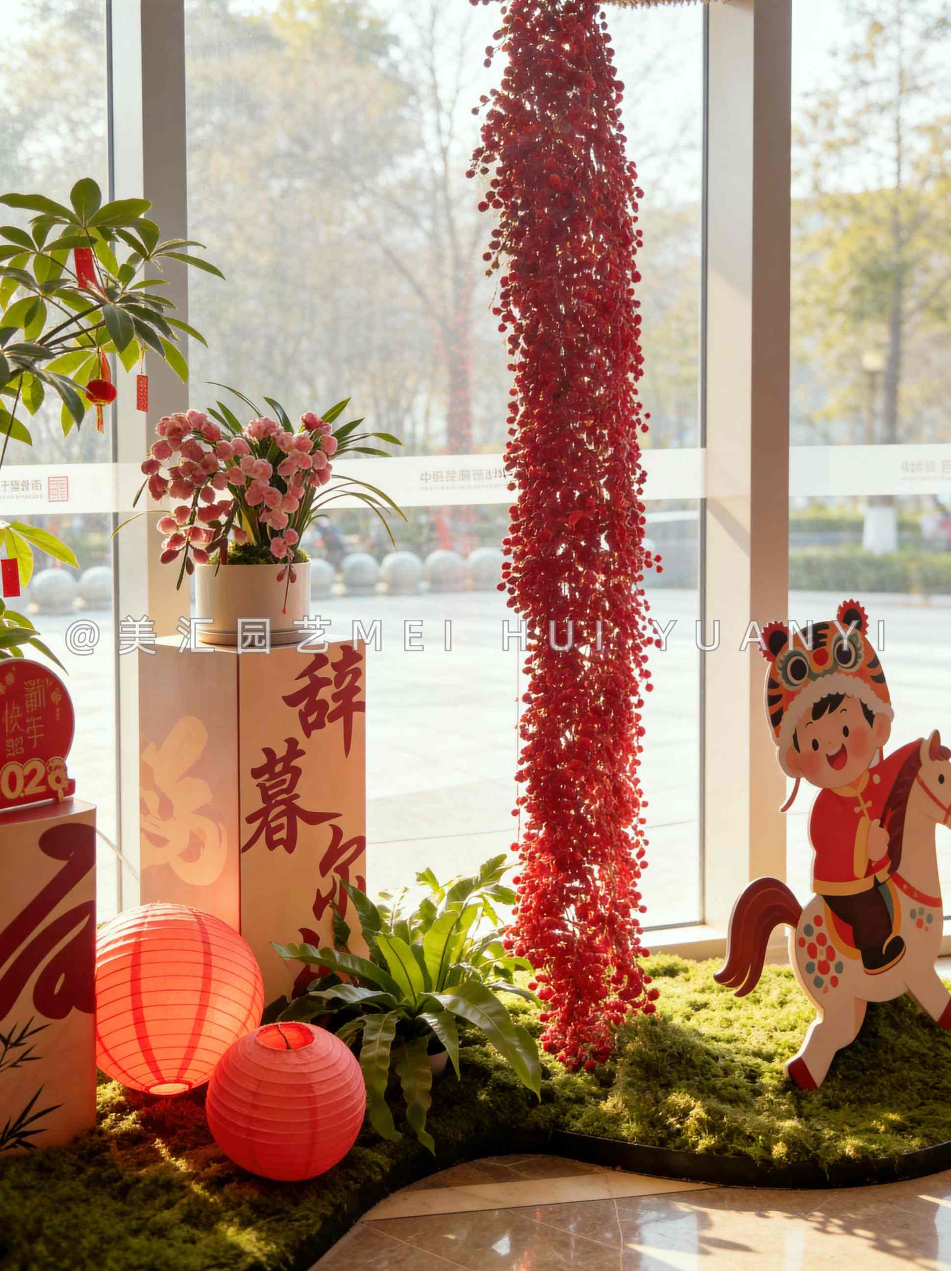 大堂的新年植物造景太懂中國(guó)人的浪漫了: 苔蘚鋪成柔軟的綠毯,紅果垂成流動(dòng)的瀑布,發(fā)財(cái)樹掛著討喜的小紅箋。還有虎頭娃娃騎著竹馬,把 “馬上平安”“馬上發(fā)財(cái)” 的祝福 都種在了這一方小天地里。 站在暖融融的陽(yáng)光里,突然就懂了 “煙火年年” 的溫柔 ——不是轟轟烈烈的熱鬧,是紅與綠交織的松弛,是抬頭就能撞見的歡喜。